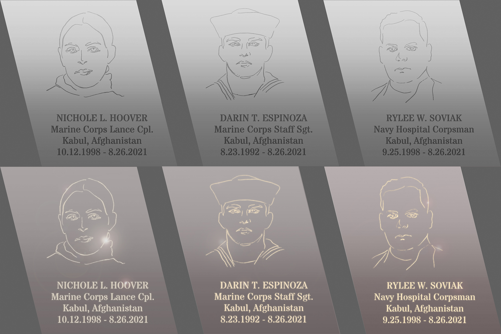 Inside walls, each Service Members is honored on walls with their unique individual portrait, name and other facts on 9"x11" stainless steel plaque. Portrait artworks and texts are cutout to allow natural and illumination lights to pass through to bring them to life. The portraits highlight personal aspects in dignified and clear line which become the heart of the memorial.